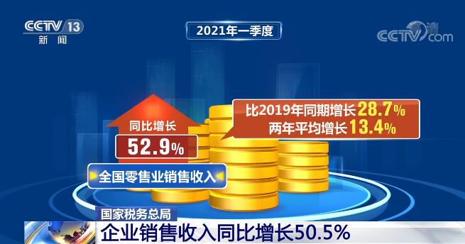 国家税务总局增值税发票数据显示,2021年一季度,全国企业销售收入同比增长50.5%,比2019年同期增长27.2%,两年平均增长12.8%。