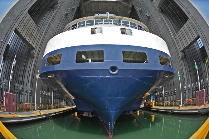 4月19日10时30分,大型汽运船“安吉207”号缓缓驶入升船机的上游引航道,将通过升船机翻越三峡大坝,船上满载着数百台新车。 (湖北日报全媒记者 刘曙松 摄)