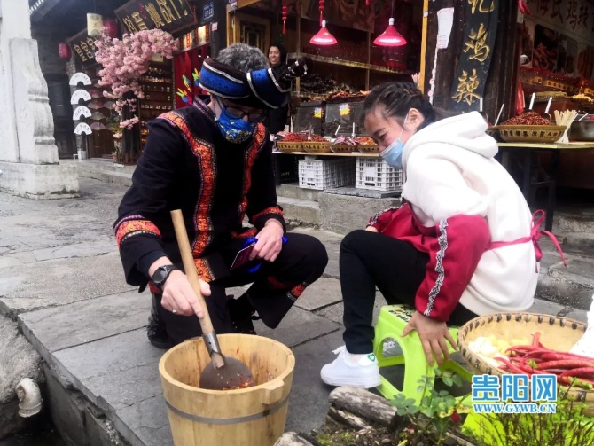 在一家鸡辣角特产店的门口,来自英国的网络名人Barrett Lee John 感受当地的宰辣角,不时向店家询问其中需要放的配料和其中包含的民族文化内涵,拿着一根辣角笑容满面的对着镜头展示。
