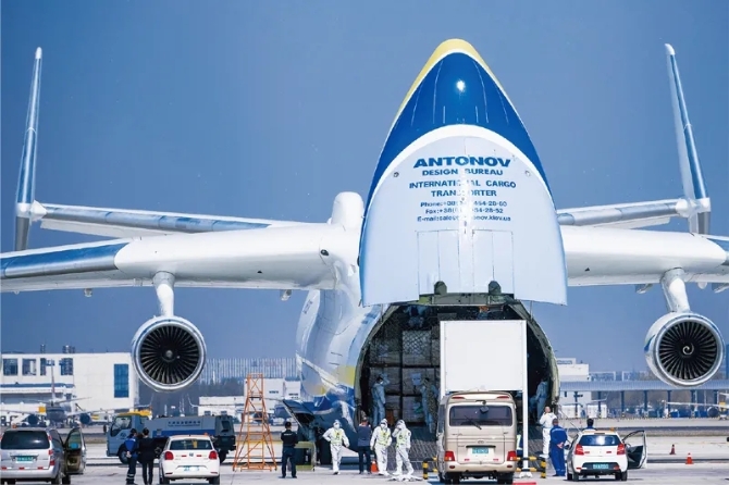 疫情以来,中国发起了新中国成立以来规模最大的全球人道主义行动,向多国提供了口罩2000多亿只、防护服20亿件、检测试剂盒8亿份,承担起全球抗疫物资最大供应国的责任,有力支持全球疫情防控。图为2020年4月13日,全球最大运输机AN225在天津滨海国际机场装载国际防疫物资。中新社记者 佟郁/摄