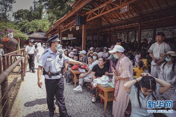 10点,在西双版纳野象谷景区,气温高达36摄氏度,野象谷景区执勤点民警正在景区内维护秩序。游客们从全国各地涌向这个山谷,这便成为民警们的“考场”。