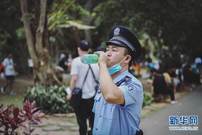 11点,执勤间隙,民警补充水分。炎热的天气加上节日期间高强度的工作,他们需要比平时更多的水分。