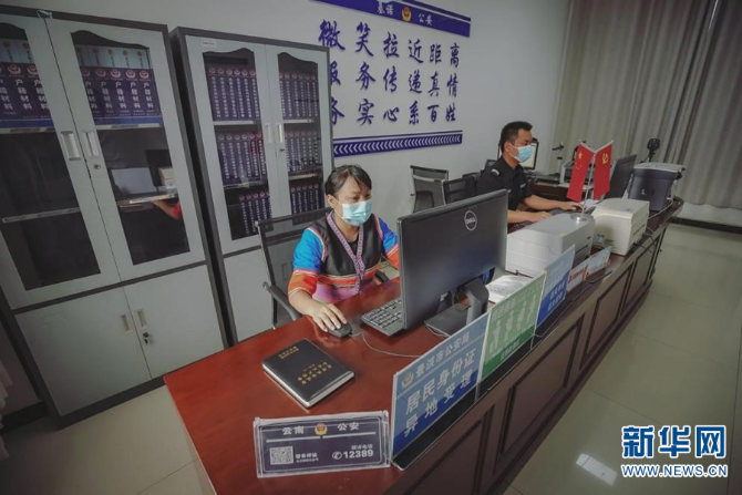 14点,在基诺山派出所户籍室,为方便当地基诺族群众,派出所工作人员身着民族服饰,用基诺语为办事群众进行讲解。