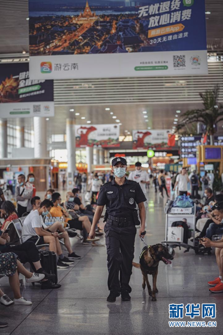 16点,在西双版纳嘎洒国际机场,民警牵着警犬巡逻。