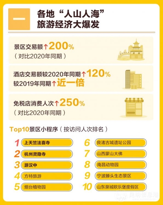今年五一“人从众”,出游人次创下历史新高,火爆的“补偿式出游”直接带动了景区、酒店、商圈等消费的大幅飙涨。支付宝数据显示,从5月1日到5月3日,全国景区交易额较2020年同期上涨200%,酒店交易不仅较去年同期增长120%,甚至比2019年同期还要上涨近一倍。其中,游客在洛阳2021年线下消费笔数较2020年同期新增超150%,成为全国线下消费笔数增长最高的城市之一。