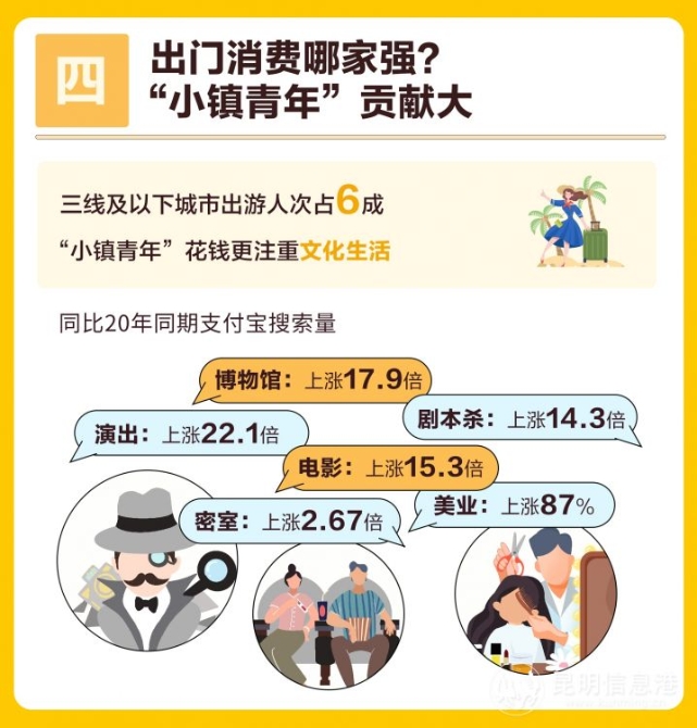 值得注意的是,“小镇青年”成为五一假期拉动消费新动力,三四五线出游消费人次占比6成。而且,这一届“小镇青年”花钱更注重消费品质和文化生活享受。支付宝数据显示,同比2020年同期,三四线人群对博物馆、剧本杀、线下演出、密室、美业等搜索均有大幅增长,其中演出搜索量上涨超22倍、博物馆搜索量涨近18倍。(昆明信息港 记者昝娟娟)