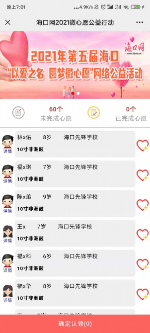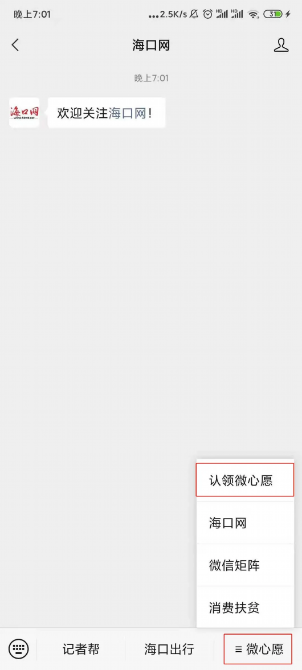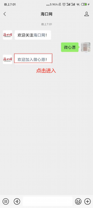 关注海口网微信公众号,私信发送“微心愿”或点击右下角【微心愿】菜单