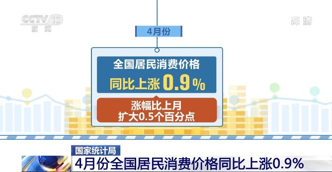 先看居民消费价格,4月份,全国居民消费价格同比上涨0.9%。涨幅比上月扩大0.5个百分点。其中,食品价格下降0.7%,非食品价格上涨1.3%。1到4月平均,全国居民消费价格比去年同期上涨0.2%。