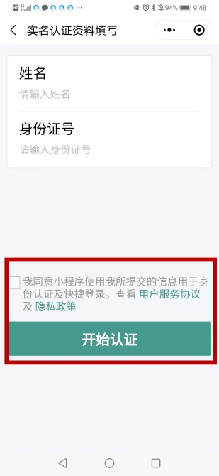 实名认证资料填写,勾选“同意政策”后点击“开始认证”