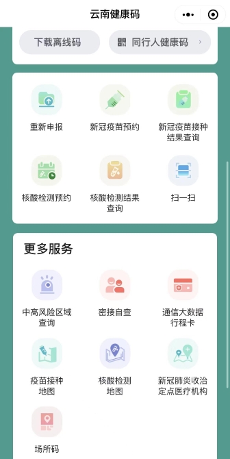 此次“云南健康码”升级更新,利用了大数据分析精准研判,操作更为简单,功能更加完善。集成人脸识别、新冠疫苗预约及结果显示、核酸检测预约及结果查询、同行人代填报、中高风险区域查询、密接自查、大数据行程卡、疫苗接种地图查询、核酸检测地图查询、医疗机构地图查询等实用功能。新版“云南健康码”支持一码多端,包括微信、支付宝、一部手机办事通等。