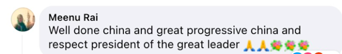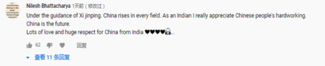 在习近平的领导下,中国在各领域都在崛起。作为一个印度人,我真心欣赏中国人的努力。中国就是未来。爱中国,尊重中国——来自一个印度网友的告白。(CGTN)