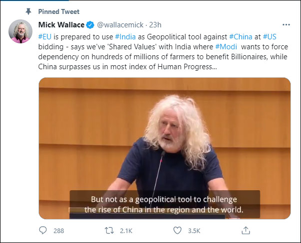 米克·华莱士在推文中指出,在美国的要求下,欧盟准备利用印度作为地缘政治工具来对付中国,说我们与印度有“共同价值观”。莫迪想要迫使数亿农民成为附庸,从而让亿万富翁获利,而中国在大部分“人类进步指标”上都超越了我们……