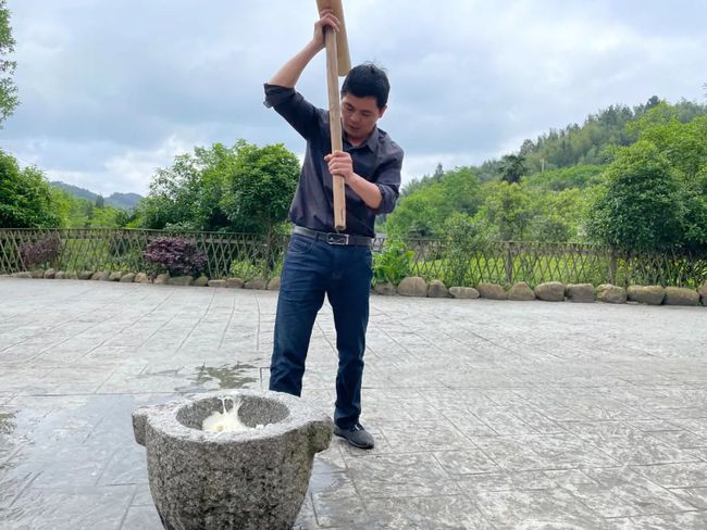 就在大嫂尹娇月家隔壁,三弟彭德良一边打着糍粑,一边向游客讲解。