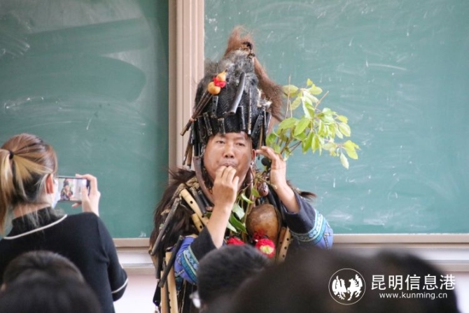 讲座主要以表演及手工体验的形式开展,现场在云南民族博物馆馆员王静介绍完展馆情况后,伴随着悠扬的乐器声,一位身上挂满乐器的云南民族民间歌舞乐传承人罗凤学登场,为现场100余名师生们先后表演了10多种乐器,吸引得大家掌声不断,纷纷举起手机录像。