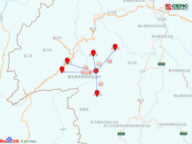 周边县城:震中距施甸县33公里、距永德县46公里、距昌宁县58公里、距龙陵县58公里、距芒市66公里,距德宏傣族景颇族自治州66公里,距昆明市358公里。