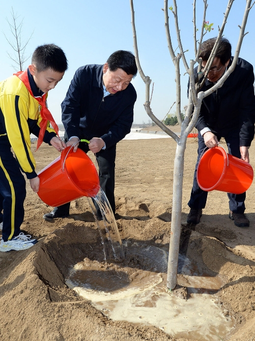 ↑2014年4月4日,党和国家领导人来到北京市海淀区南水北调团城湖调节池参加首都义务植树活动。这是习近平同大家一起给刚栽下的树苗浇水。植树结束时,习近平向工程负责人了解了南水北调水源的水质与保护和调节池施工进展情况。