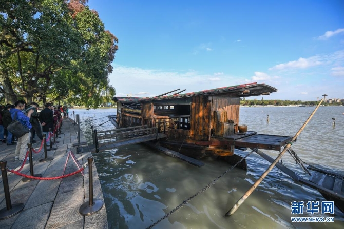 停靠在嘉兴南湖湖心岛的南湖红船(2020年10月27日摄)。新华社记者 徐昱 摄