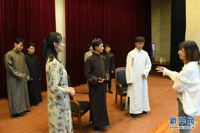 浙江嘉兴学院红船剧社的社员在学校排练话剧《初心》(2020年7月16日摄)。新华社记者 翁忻旸 摄