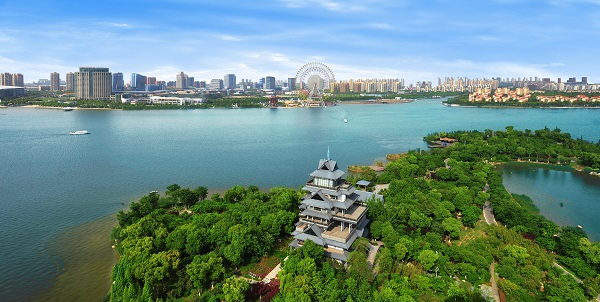 金鸡湖畔,一座由两个动态扭转的圆相叠而成的“圆融”雕塑,象征着中新两国政府间的友好合作,见证了江苏苏州工业园区蝶变腾飞的奇迹。