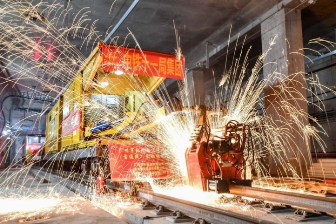 中铁十一局轨道焊机在焊接广州地铁18号线首通段最后一个钢轨接头(2021年4月20日摄)。 新华社记者 刘大伟 摄