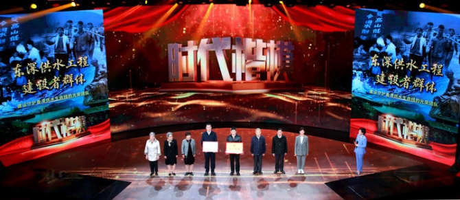 东深供水工程建设者群体代表在“时代楷模”发布仪式上领取“时代楷模”奖牌和证书(2021年4月18日摄)。 新华社记者 潘旭 摄
