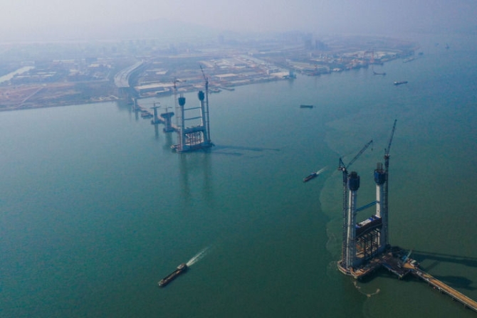 距此正北38公里,内伶仃洋里,连接珠江两岸的又一超级跨海工程建设正如火如荼——深中通道初具规模。在中山市珠江西岸的马鞍岛旁,一排巨大桥墩延伸向水天一色处,远处伶仃洋大桥主塔已施工至210米高程,中山大桥主塔已施工至150米高程……