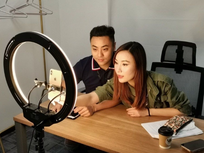 “港夫广妻”李剑禧、孙嘉晞正在直播。(新华社记者 徐弘毅 摄)