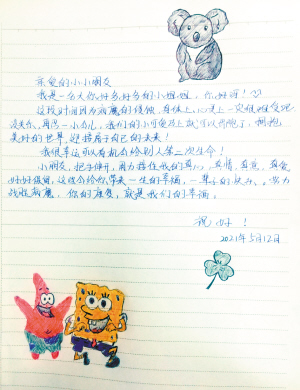 这期间,小聂收到这名小女孩父母写来的一封感谢信。5月12日,她拿起笔给这个小妹妹写了一封满怀深情的鼓励信,并画了“海绵宝宝”“派大星”的动画形象,鼓励这个小妹妹早日战胜病魔,健康成长。信里这样写道:“再忍一会儿,我们的小可爱马上就可以出去跑了,拥抱美好的世界,迎接属于自己的未来!我很幸运可以有机会给别人第二次生命!”