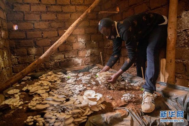 2020年9月9日,在卢旺达首都基加利,埃马纽埃尔·阿希马纳收获食用菌。阿希马纳在中国专家指导下掌握了菌草技术。新华社发(西里尔·恩德格亚摄)