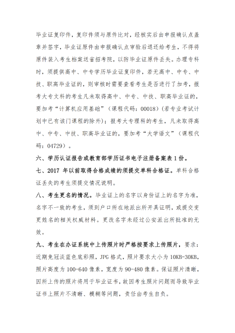 符合学完该专业考试计划所规定的全部课程并取得合格成绩;有免考课程的,办理了免考手续;完成该专业所规定的实习、实验、论文答辩(设计)或其它实践性环节的考核,并取得合格成绩;外省转入考生须在我省取得专科不少于5门、本科不少于4门的统考合格成绩等条件的考生即可申请毕业。办理本科毕业证书的考生,需具有国家承认学历的国民教育系列的专科及专科以上毕业证书。报考医学类护理专业(专科)的社会考生须取得省级卫生行政部门颁发的执业护士证书(报考时需出具相应证明)。