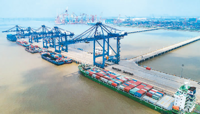 5月17日,江苏南通通海港区集装箱码头,大型机械正在吊装货物。