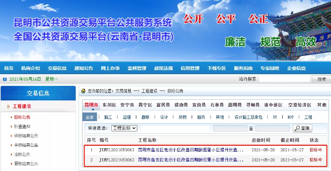5月21日,昆明市公共资源交易平台网站发布《昆明市盘龙区老旧小区改造一期万发里小区、四期铸管厂职工宿舍及橡胶管带厂职工宿舍改造提升改造项目招标公告》。