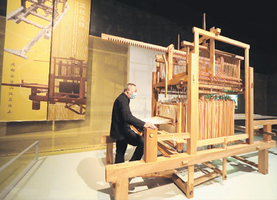 工作人员在复原的汉代提花机上演示织锦。杜建坡摄