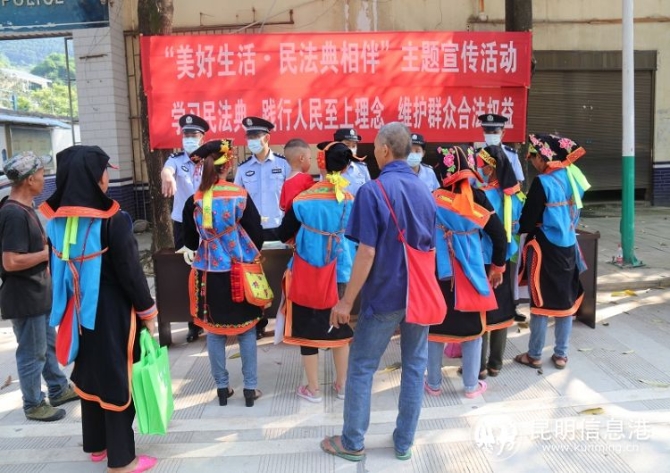 金水河边境派出所利用赶集日,在广场、集市、农贸市场等地通过悬挂宣传主题标语、派发宣传资料、小喇叭播放民法典知识等形式,结合群众生活所需多方位宣讲民法典内容。同时,充分考虑辖区苗族、傣族、哈尼族、瑶族等少数民族居多的实际,组织精通民族语言的民辅警深入街头着重宣讲婚姻、继承、夫妻财产关系等与民众生活息息相关的热点话题,采取以案释法的方式深入浅出地讲解,获得了群众的一致好评。