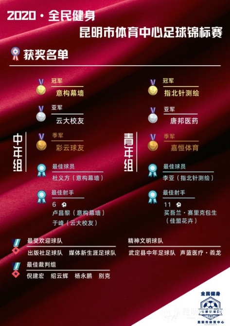 5月29日,全民健身 · 2020昆明市体育中心足球锦标赛在昆明市体育中心体育场落幕。24支球队经过近半年的争夺,最终指北针测绘队、意构幕墙队分获青年组和中年组冠军。