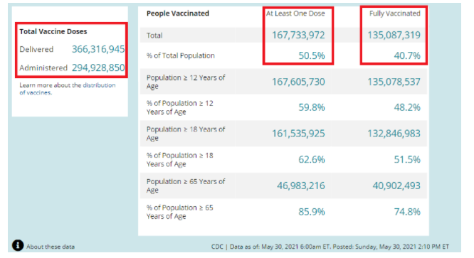 美国疾控中心(CDC)最新统计显示,截至当地时间5月30日上午,美国已完成接种新冠疫苗超2.94亿剂,已分发疫苗超3.66亿剂;近1.68亿人至少接种了一剂疫苗,占美国总人口过半;超过1.35亿人完全接种疫苗,占比四成以上。