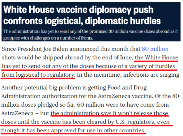 美国总统拜登早先曾高调承诺,在6月底前将向海外输送8000万剂疫苗。然而,这些疫苗直到现在仍然不知所踪。