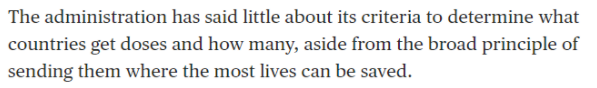 尽管拜登曾宣称美国不会利用这些疫苗来获得其他国家的支持,但他也承认疫苗是一个“宝贵的外交工具”。而除了“把疫苗运往能挽救最多生命的地方”这一宽泛原则外,美国政府对分配疫苗的具体标准只字未提。