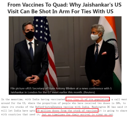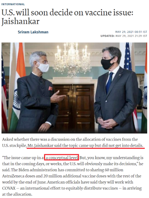 为了落实美国的疫苗援助,印度外长苏杰生上周专门访问了华盛顿。不过据印媒报道,在媒体问及此事时,苏杰生只是表示,疫苗问题在他访美时“被提了出来”,但只存在于“概念层面”,并未涉及细节。“美方可能会很快做出决定”。
