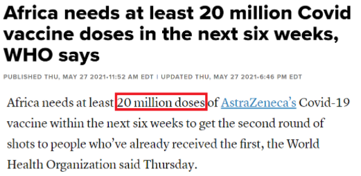 更紧急的是,非洲地区已经接种了第一剂疫苗的有限人口正面临着在有效期内等不来第二剂疫苗的风险。世卫组织当地时间5月27日为此专门提醒,非洲在未来六周内需要至少2000万剂阿斯利康疫苗,以便该款疫苗使用者完成接种。