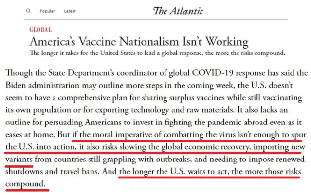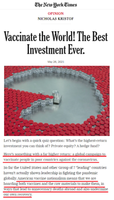 《纽约时报》的评论文章称,为贫穷国家民众接种疫苗的回报率要远远高于投资股票和对冲基金。而美国的疫苗民族主义不仅导致了其他国家民众的不必要死亡,也破坏了美国的经济复苏。