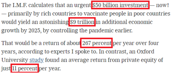 文章援引国际货币基金组织(IMF)的计算结果指出,如果富裕国家现在紧急投资500亿美元为贫穷国家民众接种疫苗,到2025年将产生惊人的9万亿美元额外经济收益。这相当于在未来四年里每年获得大约267%的投资回报率,比私人股权每年所能带来的区区11%回报率要高出几十倍。