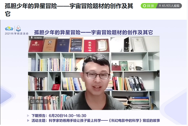 日前,中国科普作家协会2021科学阅读活动(第一季)第七期邀请科幻作家马传思和北京景山学校正高级语文教师周群,就“孤胆少年的异星冒险——宇宙冒险题材的创作及其它”做主题分享。活动由中国科普作家协会、中国科幻研究中心主办,《科学故事会》杂志协办,在新华网等平台同步直播,线上观看人次接近80万。