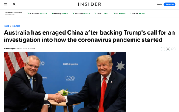 更何况,在去年美国总统特朗普这个“匿名者Q”组织最崇拜的政客,抛出了要调查武汉病毒所的说法,还不断炒作新冠病毒来自武汉病毒所的谣言后,莫里森还是第一个响应了特朗普这一呼声的西方国家领导人。而与莫里森关系密切,并在澳大利亚传媒界有着强大影响力的默多克新闻集团,也在拼命地澳大利亚的舆论场上给这种抹黑中国和妖魔化中国人的政治阴谋论造势。