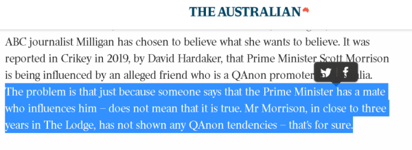 结果,这篇报道也立刻给支持莫里森的默多克新闻集团送去了炮弹。该集团旗下的《澳大利亚人报》在一篇关于此事的评论文章中就抛出了这样一个说法:虽然有人说莫里森被他那个“匿名者Q”组织的朋友影响了,但这种说法不应该被当成事实。