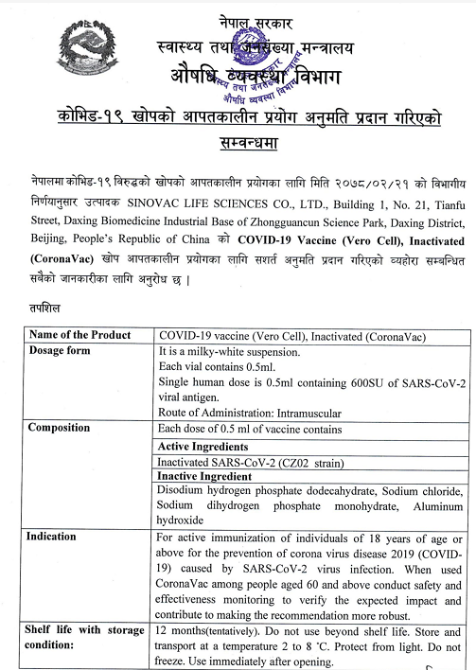 尼泊尔批准紧急使用中国科兴新冠疫苗