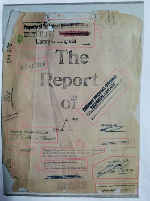 731部队进行人体实验的炭疽菌实验报告封面图,上面有德特里克堡基地的字样。新华社记者 王建 摄