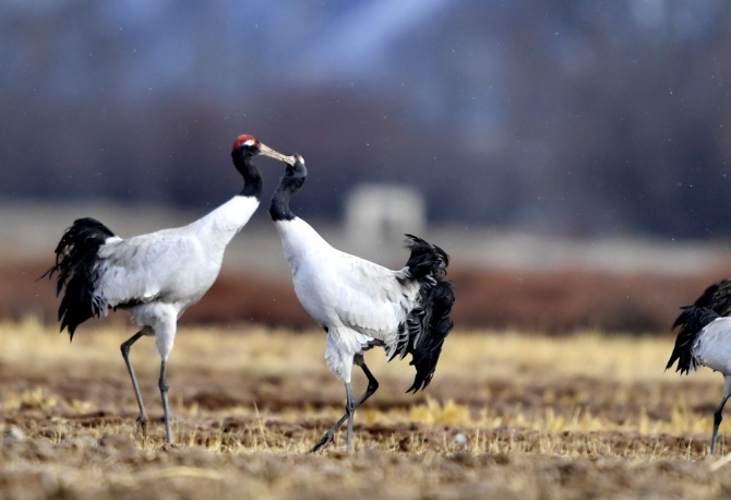 黑颈鹤在林周县黑颈鹤自然保护区里“亲吻”(2021年3月14日摄)。新华社记者 张汝锋 摄