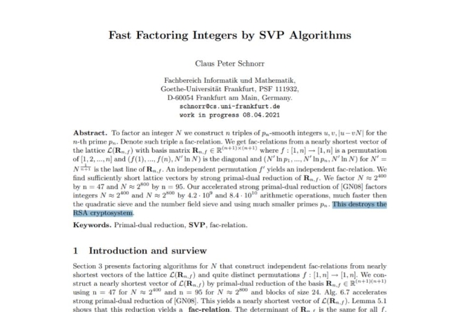 2021年3月,78岁的德国数学家、法兰克福歌德大学教授施诺尔发表一篇正在完善中的论文《通过SVP算法快速分解整数》。
