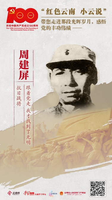 周建屏,云南宣威人,1927年加入中国共产党。曾参加辛亥革命、护国运动、护法运动。1927年,参加南昌起义。1929年,以中央特派员的身份到赣东北协助方志敏,担任江西红军独立第一团团长。1930年红十军正式成立后任军长。1930年11月—1931年2月,蒋介石调集数十万兵马对苏区进行“围剿”,周建屏等指挥红十军采取避实击虚、在运动战中攻其不备的策略,胜利粉碎了敌军“围剿”。1932年9月,红十军入闽作战,歼敌3个团,打通了赣东北、闽北与中央苏区间的联系。1937年,周建屏担任八路军115师343旅副旅长,率部参加平型关战役。11月,朱德命令周建屏等开辟晋察冀军区四分区,四分区成为晋察冀边区的模范抗日根据地。